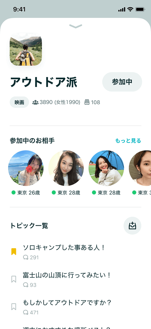 たとえば「アウトドア好きの異性と出会いたい」と考えた場合、「アウトドア派」というコミュニティに参加者の異性が表示されるのです。