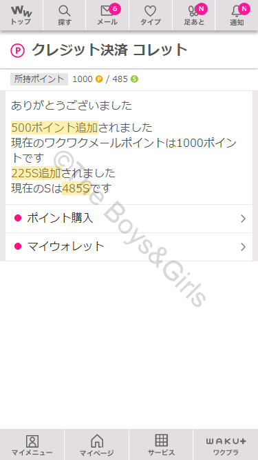 ワクワクメールでクレジットカード決済でポイントを購入するときに追加されるボーナスポイントが、すべて S(サービスポイント)に一本化されました。
