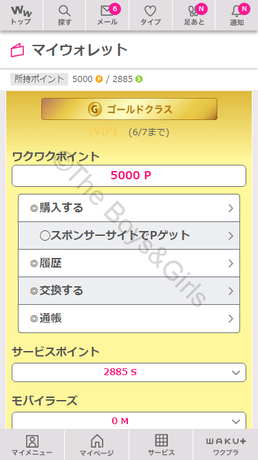 ワクワクメールで「ゴールド」クラスになった場合の「マイウォレット」画面
